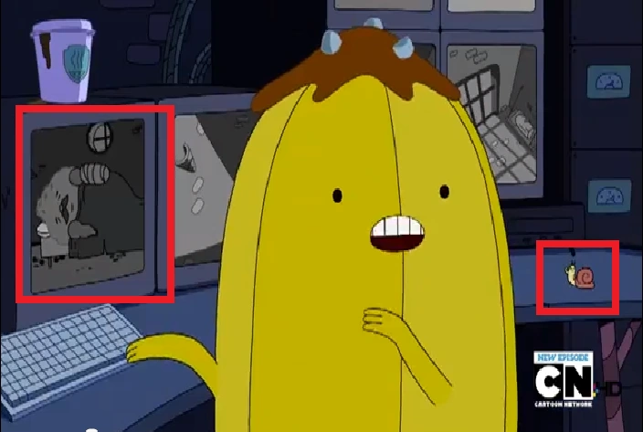 Cuando Finn y Jake le dicen a los Banana guardias que les digan su secreto, en una escena a Finn se le ven los ojos como los de Jake