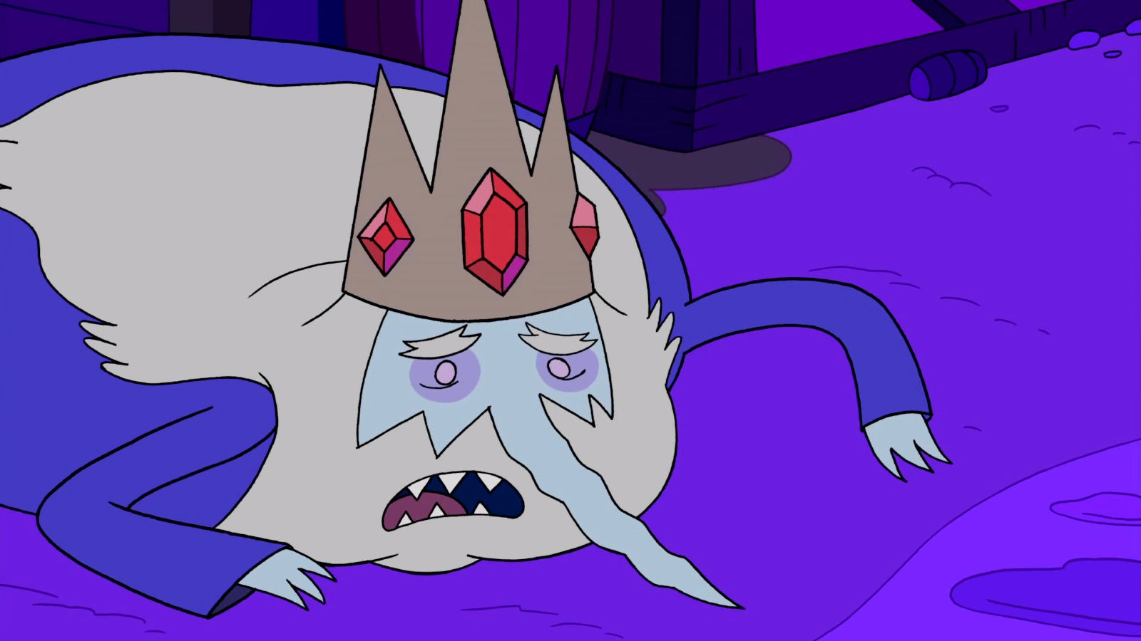 Aparece desde el episodio piloto siendo usada por el Rey Helado para atacar a Arcoiris así como para defenderse de Finn, desde entonces es usada en la mayor parte de las apariciones del Rey Helado. En Secretos Navideños, Segunda Parte se revela que Simon Petrikov al poseerla le volvió loco y lo cambió físicamente, provocó también que Betty lo dejara. En ¿Pero Qué Hicieron?, el Rey Helado dice que la creó con la magia que robó, aunque esto se contradiga con Secretos Navideños, Segunda Parte, tal vez porque se olvidó, ya que el tiene pérdidas de memoria por culpa de la corona. En Finn el Humano la corona aparece junto al esqueleto del Rey Helado cuando está siendo aplastado por una bomba atómica la qué congelo para que no explotara, luego de que Finn Alterno quiere tomar la corona aparece Marceline Alterna y le dice que la corona es suya y que tiene poderes mágicos (para más información véase Finn el Humano). En Tierra y Agua después de que la Princesa Flama destruyó completamente el Reino Helado, el Rey Helado le da la corona a Gunter para que junto con los demás pingüinos re-construyan con los poderes de la corona. Temporalmente Gunter fue el poseedor de la corona para reconstruir el Reino Helado, sin embargo la corona fue devuelta al Rey Helado en el episodio Cita de Juego. En Evergreen se revela que fue construida con la intención de conceder a su primer portador su deseo más profundo, bajo la intención de que dicho deseo sea detener un cometa en rumbo de colisión con la tierra, sin embargo Gunter acaba por ponerse la corona, concediéndole el deseo de ser igual a su maestro, acabando por conceder el deseo equivocado y en consecuencia provocando su muerte.