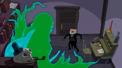 Finn, abre el armario donde se supone que se esconden el Pan de canela y BMO, pero al abrirla se encuentra con sus restos salpicados y esparcidos, a lo que la Princesa Grumosa exclama que llamaría a sus padres y el fantasma la engulló y la puso en una pintura. Finn corre a una habitación superior, pero Jake se ve envuelto por el fantasma y se lo lleva. Finn entra a una biblioteca, y desde detrás de unos estantes, la Dama Fantasma aparece y trata de llevárselo, pero escapa al romper una pared, donde entra en un observatorio.