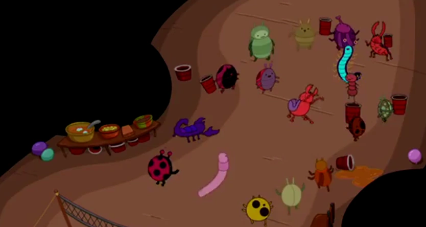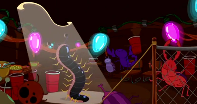 divirtiendo, y Shelby le pide al Insecto Bailarín 'agitarse'. Al principio este se niega, pero luego él está de acuerdo y comienza a bailar, lo que hace que todos se sorprendan. Todos se reúnen alrededor del insecto, y un escorpión empieza a complementarla diciendo que era el mejor insecto en esta fiesta. Esto hace a Shelby celoso, y él dice que puede hacerlo mejor. El escorpión le pregunta qué va a hacer, a lo que él responde que va a hacer parkour. Lleva a cabo su parkour saltando en un poste, a continuación, en el techo, pero se tira hacia abajo, porque no podía mantener por mucho tiempo. Cuando cayó, él dice que esta atorado, y encuentra que su parte inferior del cuerpo es cortado por una cuerda en el aire cuando se cayó.