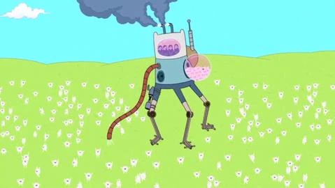 Finn les grita, que están despedidos los hombres de negocios se enojan y su Finn-bot comienza a volverse loco pero en la casa del árbol Jake trata de salir por la ventana (por que está muy gordo) y no puede moverse y Finn le dice que coma más helado ya que eso hará que su máquina explote y Jake al hacerlo comienza a crecer y el tubo se tapa causando la explosión del robot.