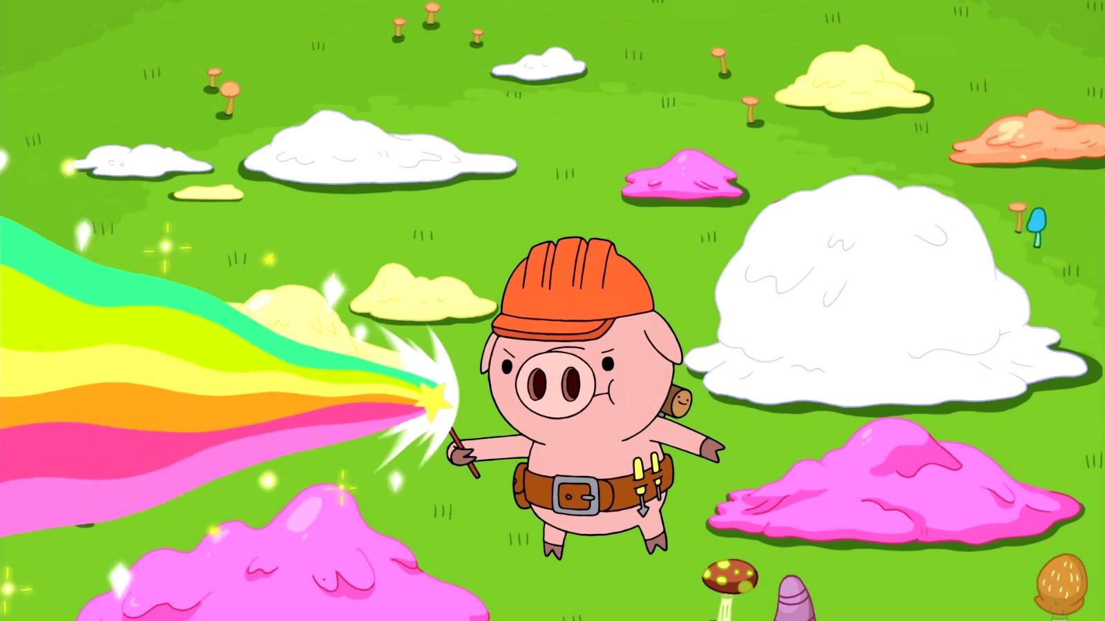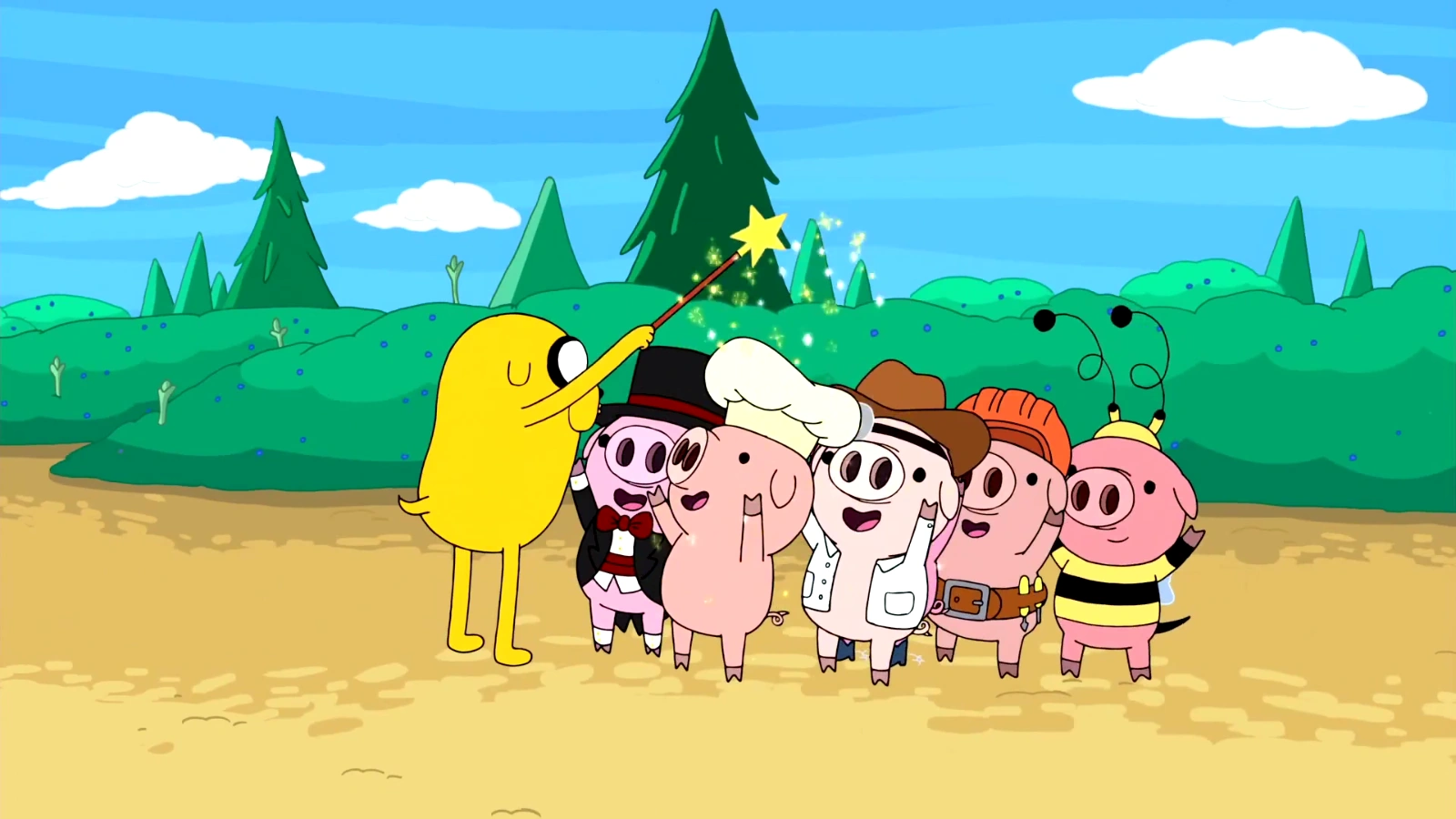 Jake tiene prisa y no puede perder más tiempo pero Finn a dado su palabra y tiene que cumplirla. Jake esta desesperado por comer helado y propone plantar los frijoles y el que sea malo destruirlo. Eso es lo que hacen: los plantan, hacen guardia pero no pueden mantenerse la noche en vela a si que se despiertan cuando sale la primera vaina. De ella salen unos cerditos vestidos de trabajadores. Para asegurarse que no son los malos les hacen unos exámenes. Una de las preguntas es a que son alérgicos y todos dibujan un helado. Finn y Jake están seguros que no es la vaina mala. De la segunda salen unas varitas de arcoiris que por supuesto no son las malas. De ahi decidieron divertirse un rato con los cerditos, jugando, dibujando, construyeron una chosa.
