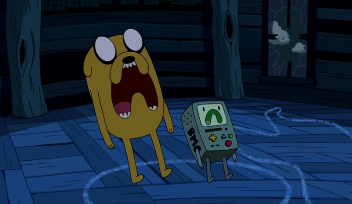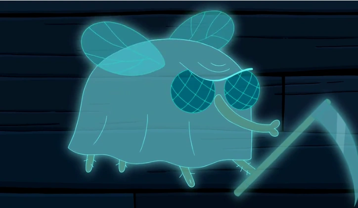 Durante la noche, Jake escucha ruidos extraños en la sala; al principio los ignora, pensando que era BMO, pero baja a chequear luego de escuchar encendido el fonógrafo, ya que según él, BMO odia la música Jazz de los 30'. En ese momento aparece el fantasma de la mosca; Jake al principio se sorprende, pero luego se asusta cuando saca una guadaña y comienza a perseguirlo junto a Finn y BMO (Quienes se despertaron cuando Jake les alertó de la mosca), y terminaron siendo perseguidos dentro y fuera de la casa. Hartos de la mosca, deciden recurrir al experto en artes oscuras y del más allá: Mentita.