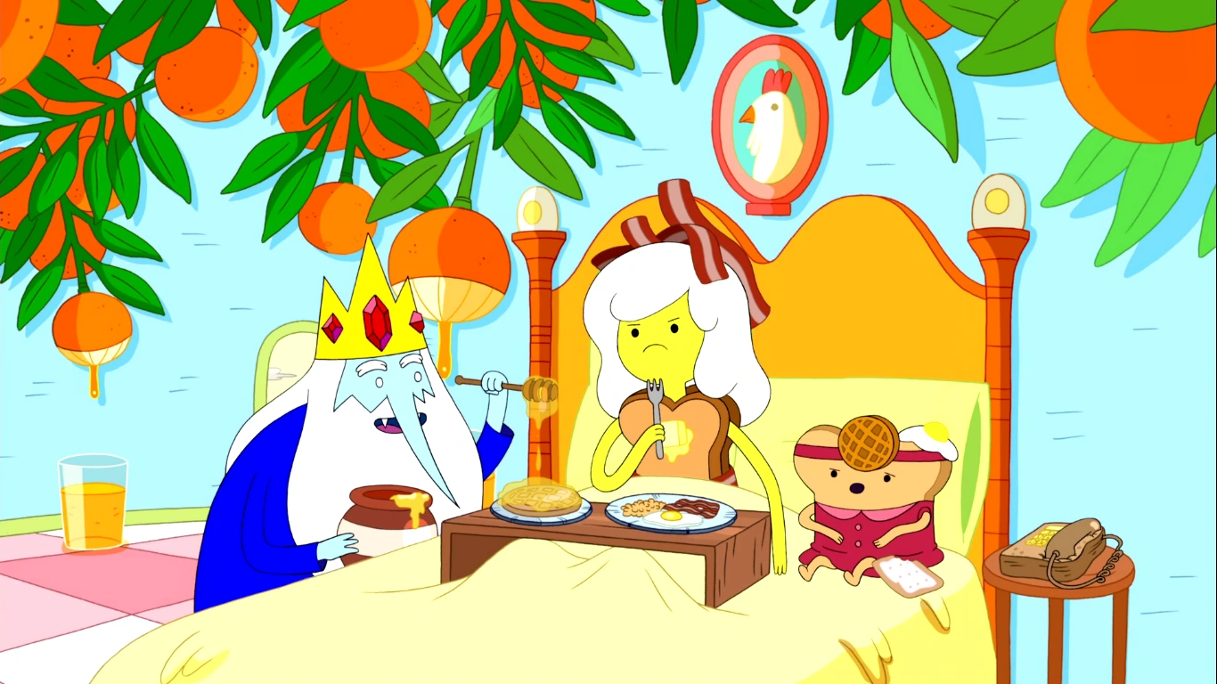 Ella tiene el pelo de huevo y su cuerpo seria como la yema. Tiene tocino en la cabeza que pareciera ser utilizado como una corona y una camisa que consiste en pan tostado con mantequilla y un cinturón de tocino. La falda se le ve como un panqueque con jarabe en él mientras que los zapatos se parecen a dos huevos con fisuras. Su diseño en bikini debuto en el juego la Señorita Princesa Ooo, esta hecho con tocinos.