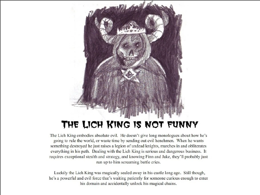 El documento dice textualmente lo siguiente: "El Rey Lich es la maldad encarnada. A él no le importa dar discursos largos sobre cómo dominará el mundo, o perder el tiempo enviando subordinados a hacer su trabajo. Cuando él quiere destruir algo sólo envía una legión caballeros no-muertos, marcha y oblitera todo a su paso. Tratar con el Rey Lich es una tarea muy seria y peligrosa, requiere de gran y excepcional cautela y estrategia, y conociendo a Finn y Jake, ellos probablemente correrán hacía él lanzando gritos de guerra".