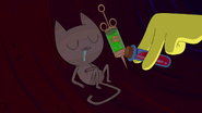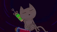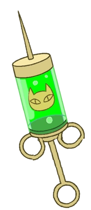 El líquido es de color verde. El exterior de la jeringa posee el rostro incrustado de Mi-Miau.